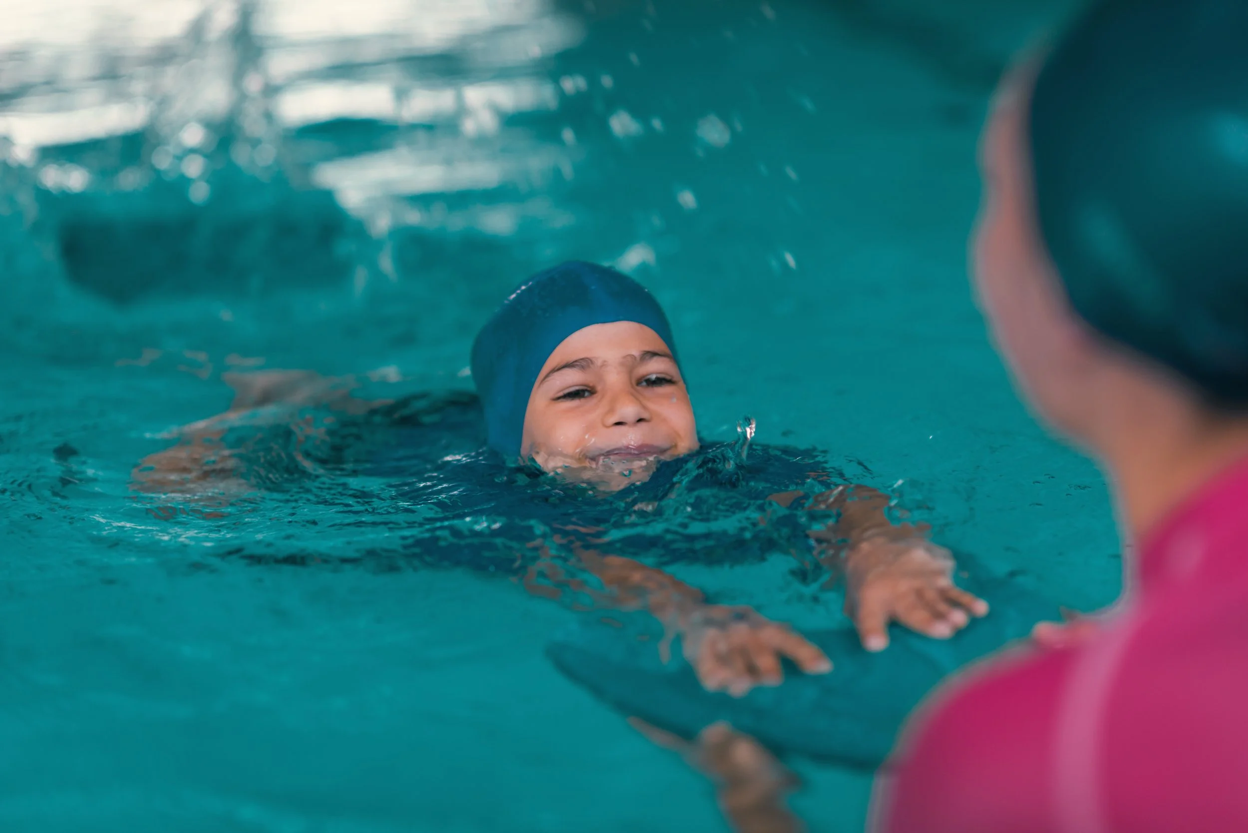 A young boy swimming in a pool, wearing a swim cap, with a woman in swimming goggles holding a board nearby.