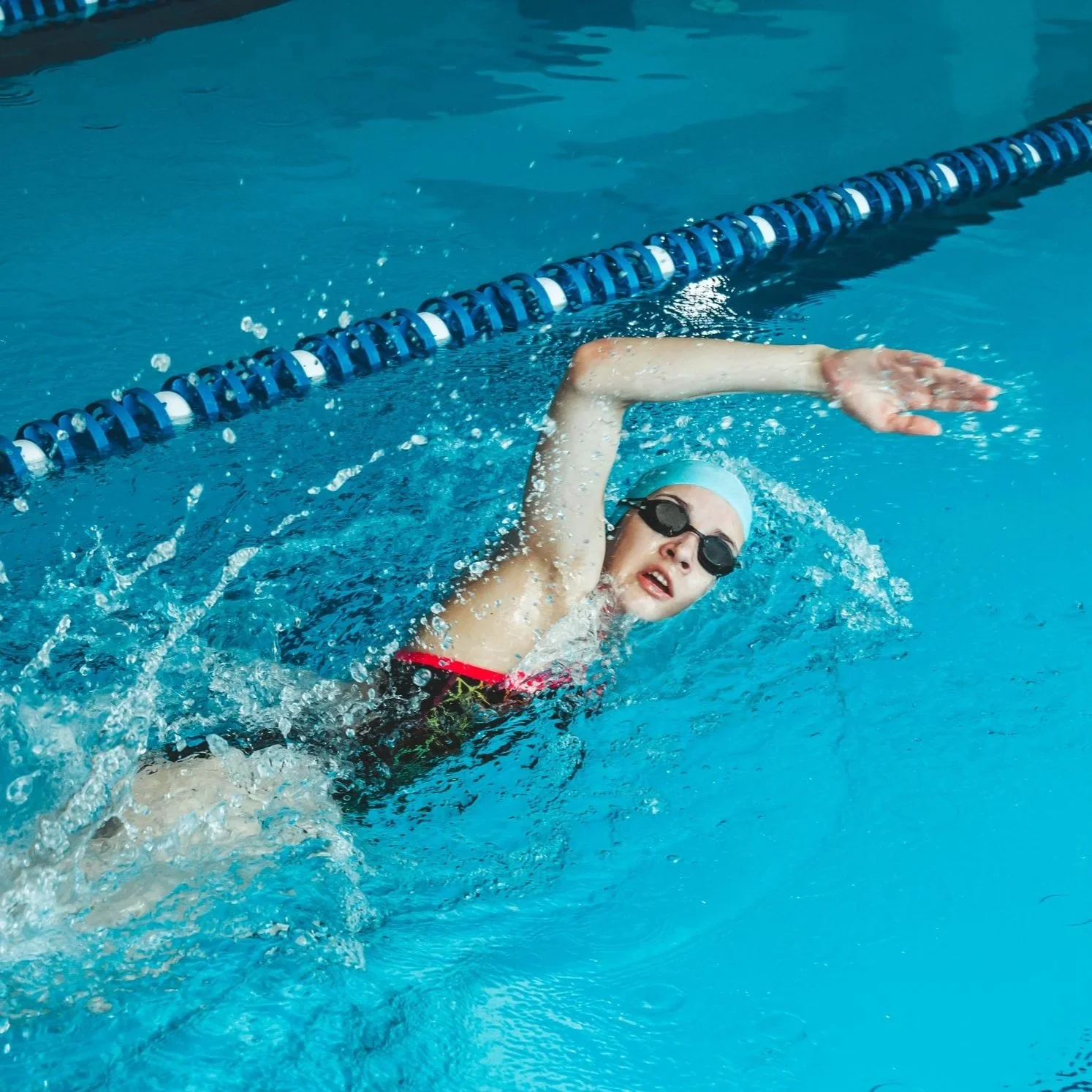 Young girl swimming in a pool, wearing swim goggles and a swim cap.