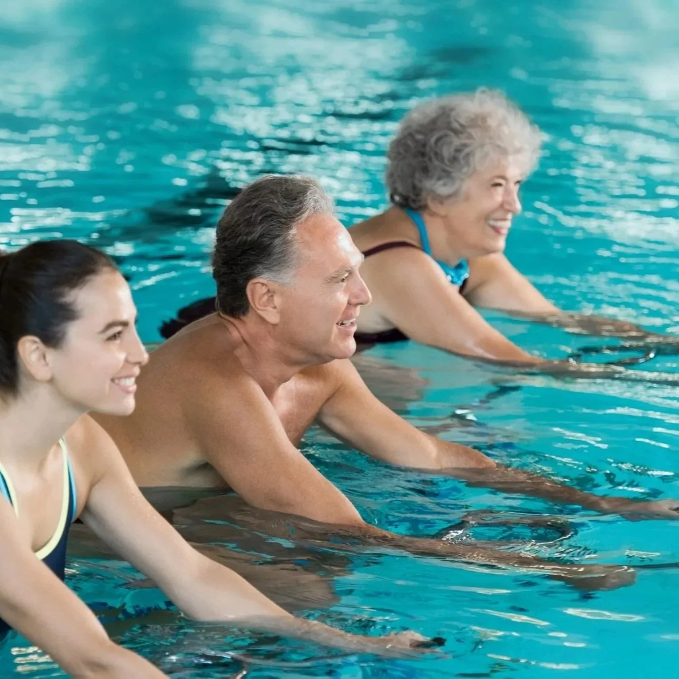 Three people, a young woman, a middle-aged man, and an elderly woman, are in a swimming pool doing water exercises and smiling.