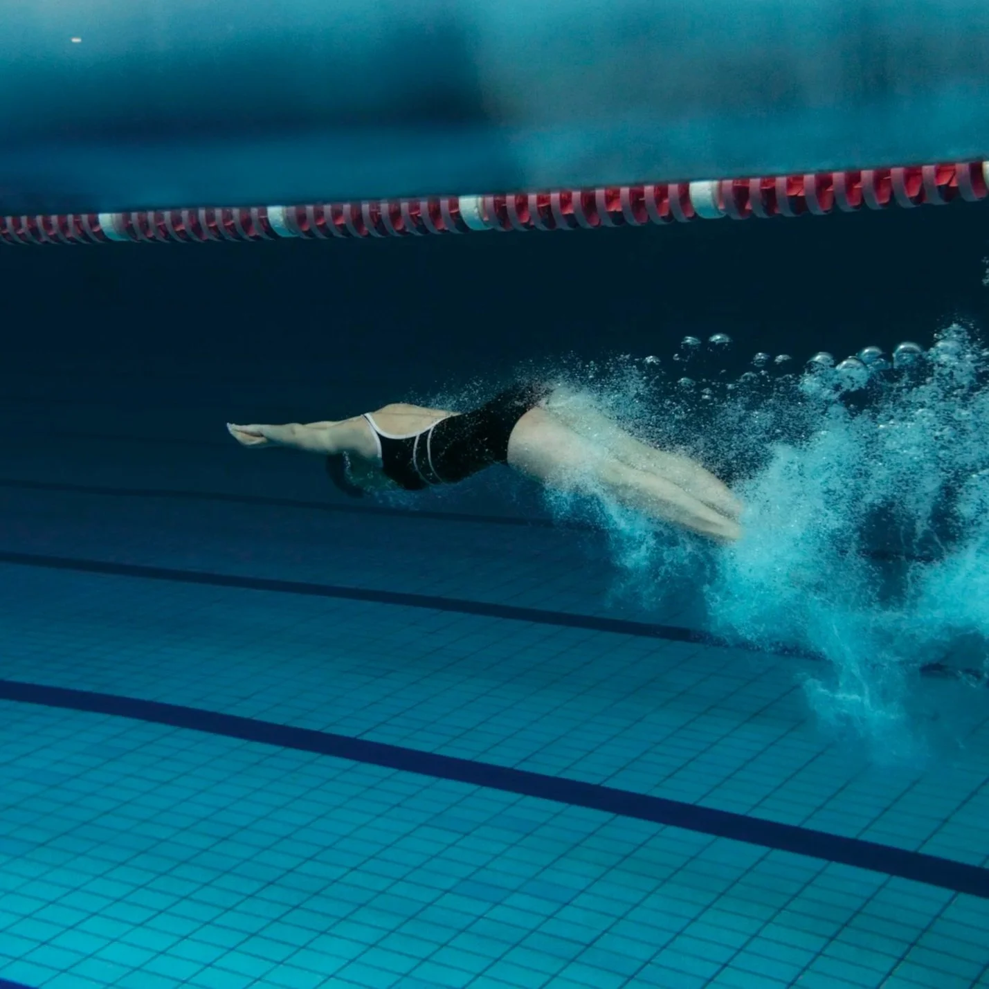 Swimmer underwater in a swimming pool doing a front crawl stroke.